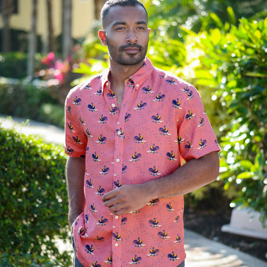 For starters, linen has lower heat conductivity compared to cotton. OK…so what are we saying here… well, linen fabrics absorb less heat from the environment or body, keeping the fabric itself cooler to the touch. It helps in reducing the sensation of warmth against the skin, making it more comfortable to wear in hot and humid climates. Our short sleeve linen shirts in striking tropical designs will keep you looking sharp and feeling more at ease on those warm days that can last from late spring into early fall.